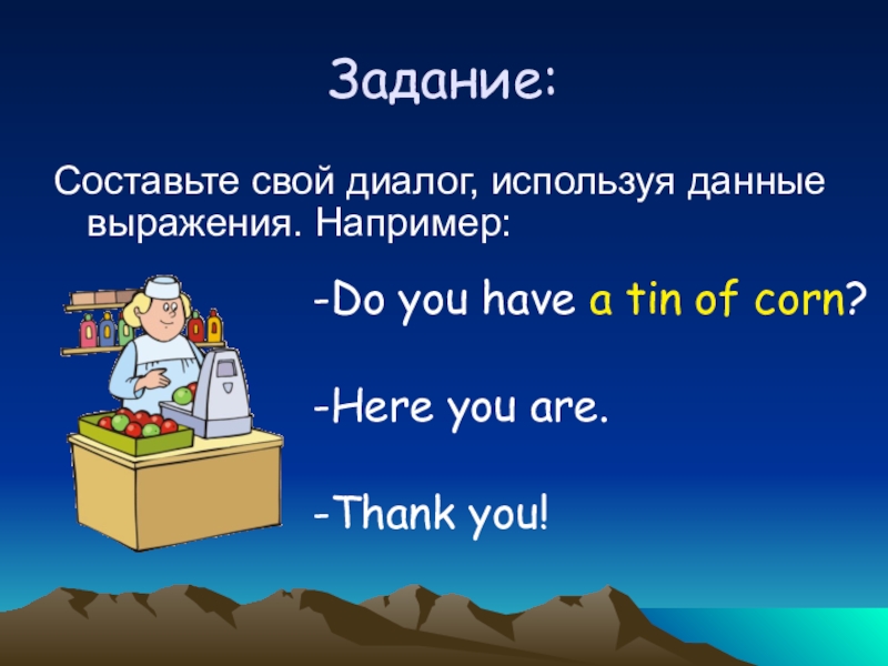 Задание:Составьте свой диалог, используя данные выражения. Например:-Do you have a tin of corn?-Here you are.-Thank you!