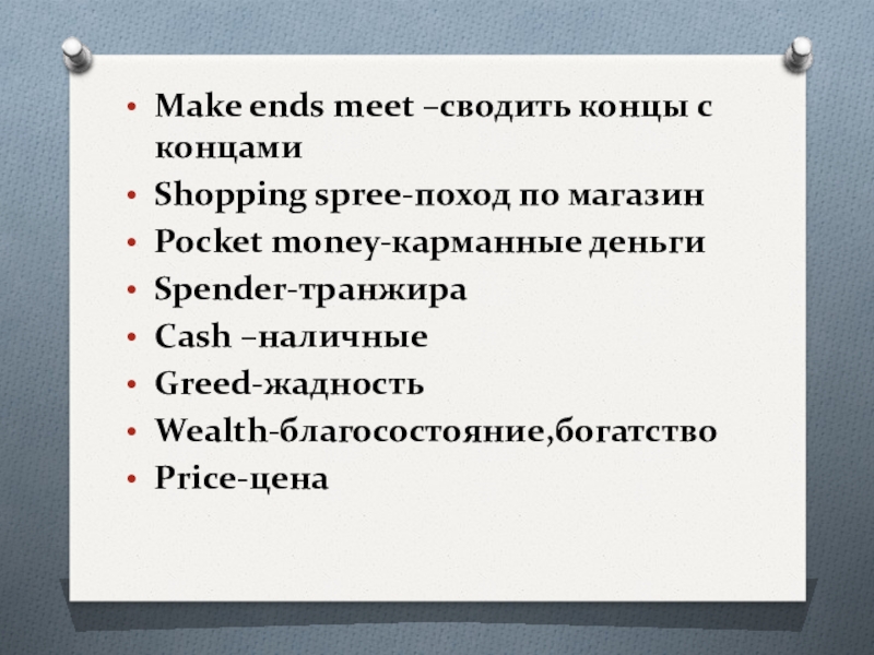 Make ends meet –сводить концы с концамиShopping spree-поход по магазинPocket money-карманные деньгиSpender-транжираCash –наличныеGreed-жадностьWealth-благосостояние,богатствоPrice-цена
