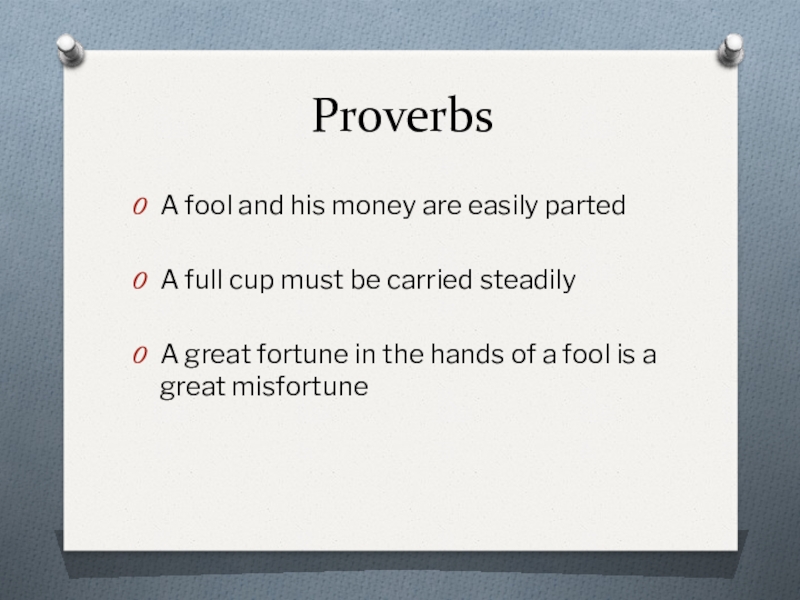 ProverbsA fool and his money are easily partedA full cup must be carried steadilyA great fortune in
