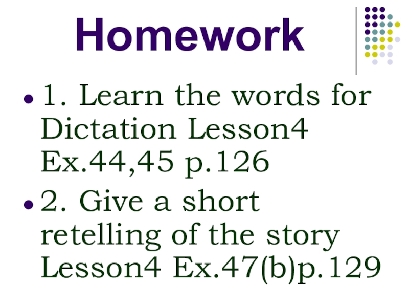 Homework1. Learn the words for Dictation Lesson4 Ex.44,45 p.1262. Give a short retelling of the story Lesson4