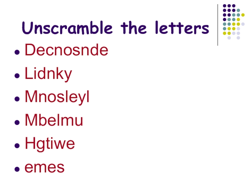 Unscramble the lettersDecnosndeLidnkyMnosleylMbelmuHgtiweemes
