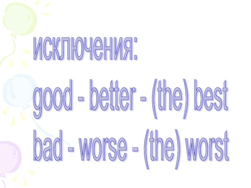 Слайд 12исключения: good - better - (the) best bad - worse -