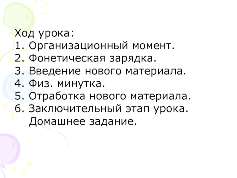 Ход урока:1. Организационный момент.2. Фонетическая зарядка.3. Введение нового материала. 4. Физ. минутка.5. Отработка нового материала.6. Заключительный этап
