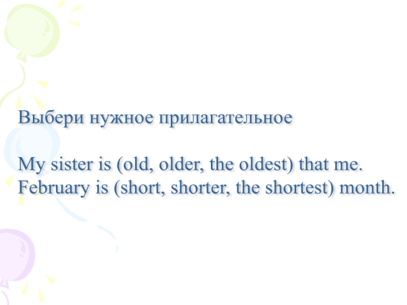 Выбери нужное прилагательное    My sister is (old, older, the oldest) that me.  February