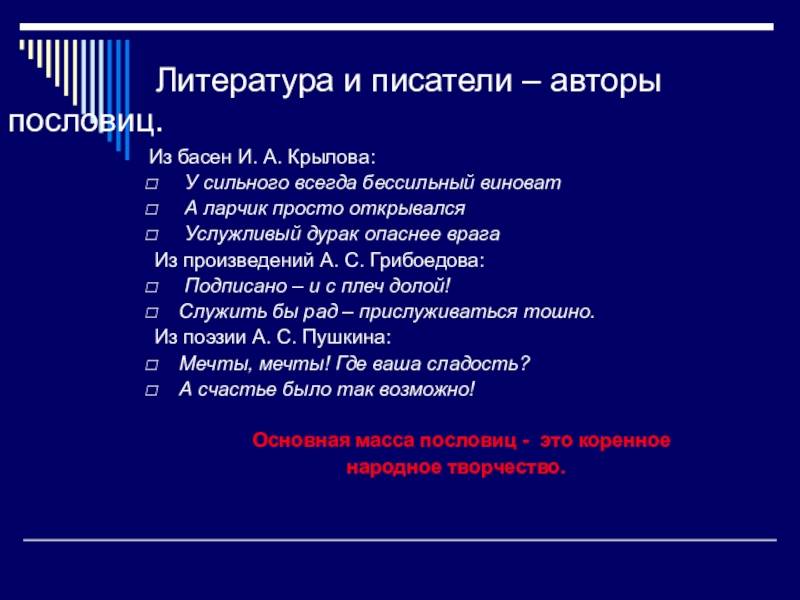 “Мудрость и дух народа ярко проявляются в его пословицах и поговорках, а знание пословиц и поговорок того или иного народа способствует не только лучшему знанию языка, но и лучшему пониманию образа мыслей и характера народа.”