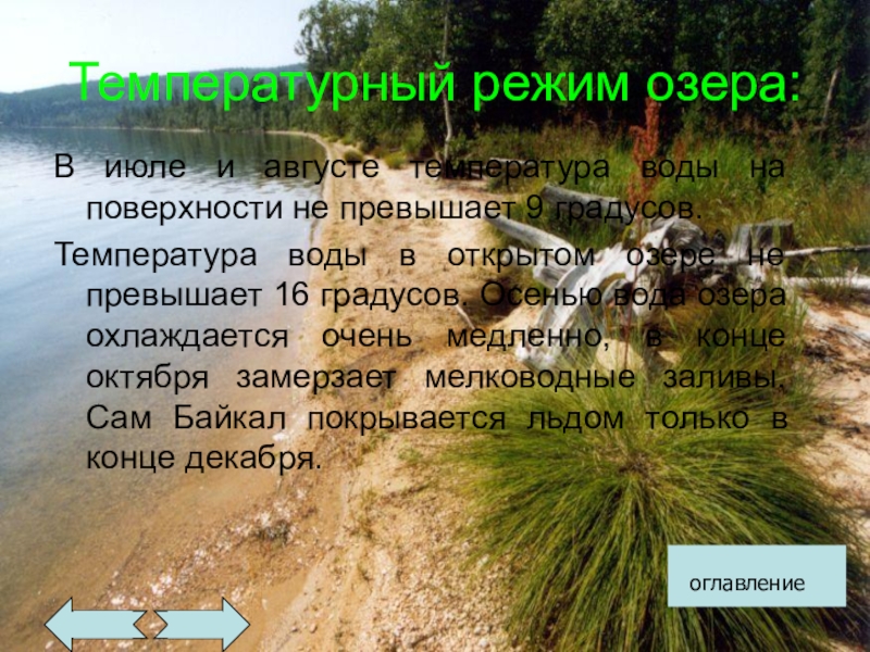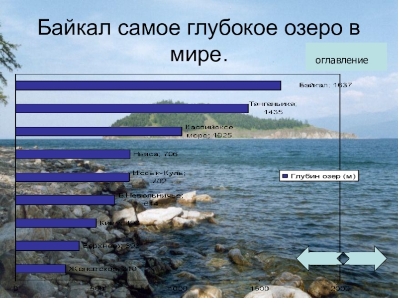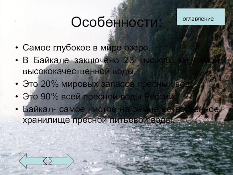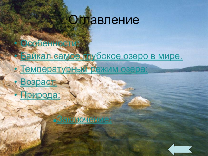 ОглавлениеОсобенности:Байкал самое глубокое озеро в мире.Температурный режим озера:Возраст:Природа:Заключение: