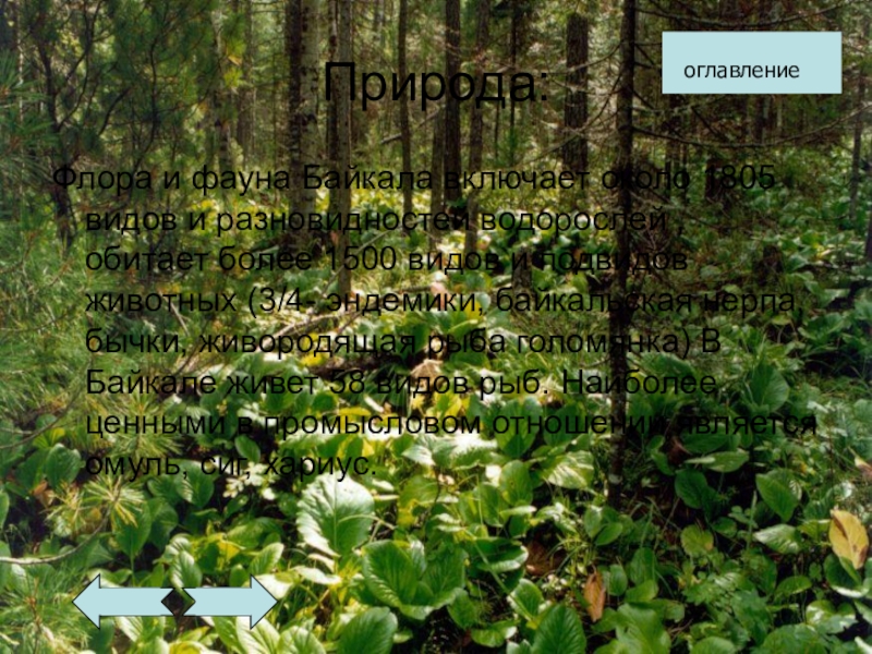 Природа:Флора и фауна Байкала включает около 1805 видов и разновидностей водорослей , обитает более 1500 видов и