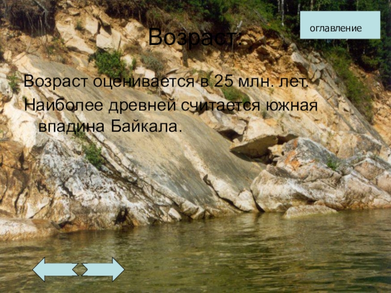 Возраст:Возраст оценивается в 25 млн. лет. Наиболее древней считается южная впадина Байкала.