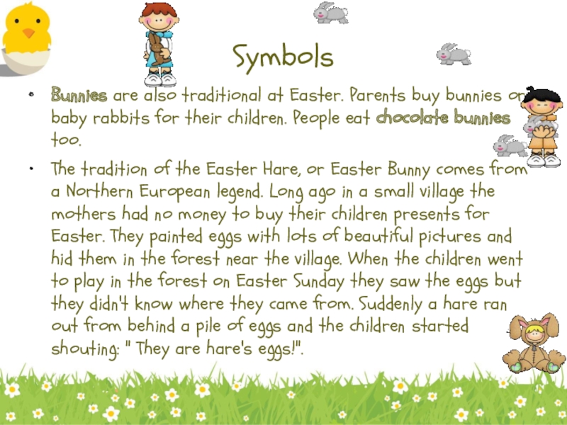 SymbolsBunnies are also traditional at Easter. Parents buy bunnies or baby rabbits for their children. People eat