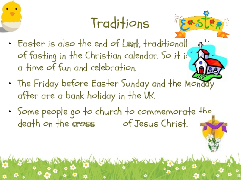 TraditionsEaster is also the end of Lent, traditionally a time of fasting in the Christian calendar. So