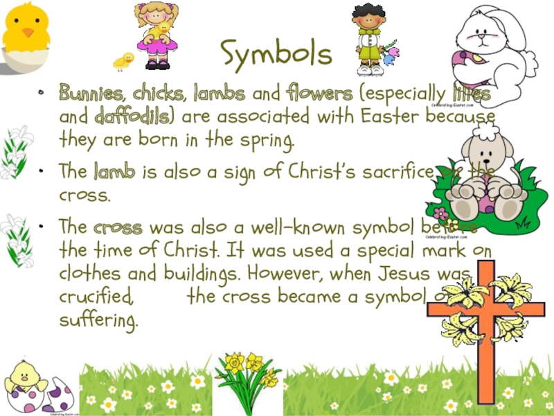 SymbolsBunnies, chicks, lambs and flowers (especially lilies and daffodils) are associated with Easter because they are born