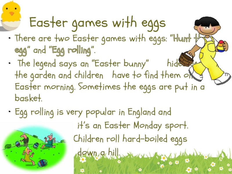 Easter games with eggsThere are two Easter games with eggs: “Hunt the egg” and “Egg rolling”. The