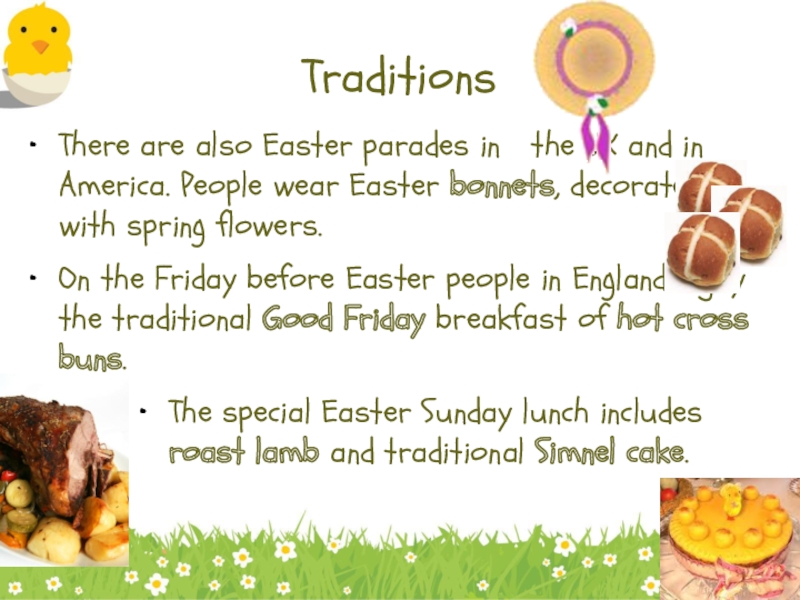 TraditionsThere are also Easter parades in  the UK and in America. People wear Easter bonnets, decorated