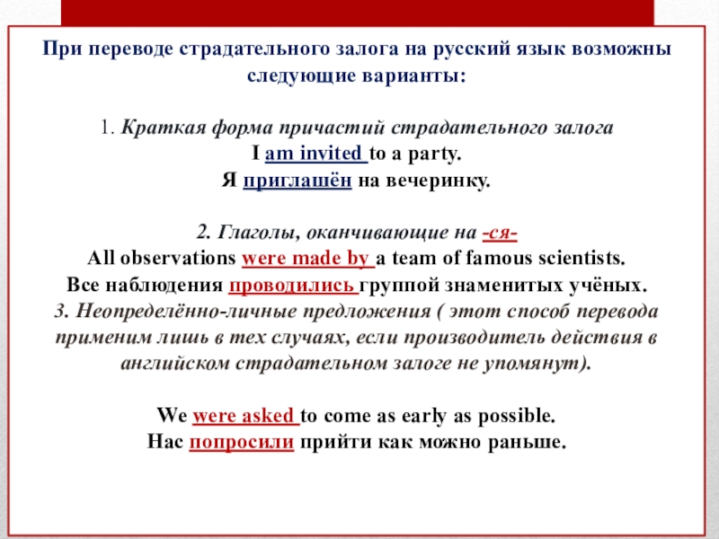 При переводе страдательного залога на русский язык возможны следующие варианты: