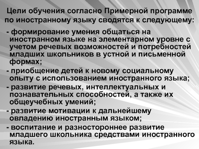 Слайд 68Цели обучения согласно Примерной программе по иностранному языку сводятся к следующему: