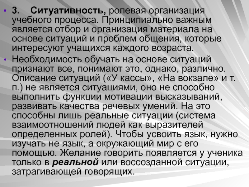 Необходимость обучать на основе ситуаций признают все, понимают это, однако, различно. Описание ситуаций («У кассы», «На вокзале» и т.п.) не является ситуациями, оно не способно выполнить функции мотивации высказываний, развивать качества речевых умений. На это способны лишь реальные ситуации (система взаимоотношений людей как выразителей определенных ролей). Чтобы усвоить язык, нужно изучать не язык, а окружающий мир с его помощью. Желание говорить появляется у ученика только в реальной или воссозданной ситуации, затрагивающей говорящих.