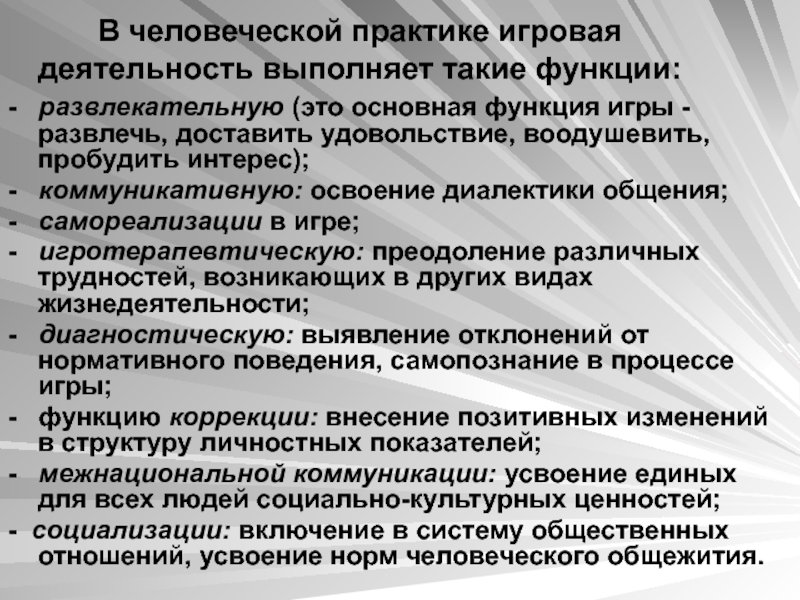 Слайд 5В человеческой практике игровая деятельность выполняет такие функции: