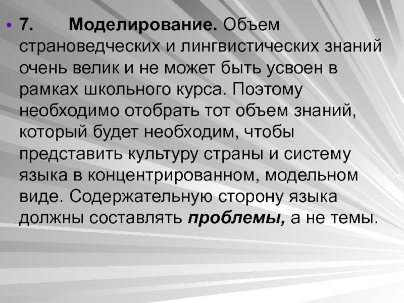 Слайд 637. Моделирование. Объем страноведческих и лингвистических знаний очень велик и не