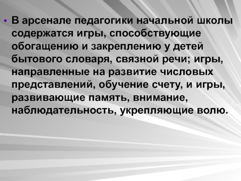 Слайд 23В арсенале педагогики начальной школы содержатся игры, способствующие обогащению и закреплению
