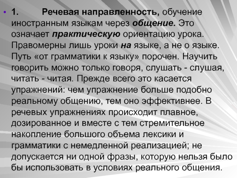 ориентацию урока. Правомерны лишь уроки на языке, а не о языке. Путь «от грамматики к языку» порочен. Научить говорить можно только говоря, слушать - слушая, читать - читая. Прежде всего это касается упражнений: чем упражнение больше подобно реальному общению, тем оно эффективнее. В речевых упражнениях происходит плавное, дозированное и вместе с тем стремительное накопление большого объема лексики и грамматики с немедленной реализацией; не допускается ни одной фразы, которую нельзя было бы использовать в условиях реального общения.