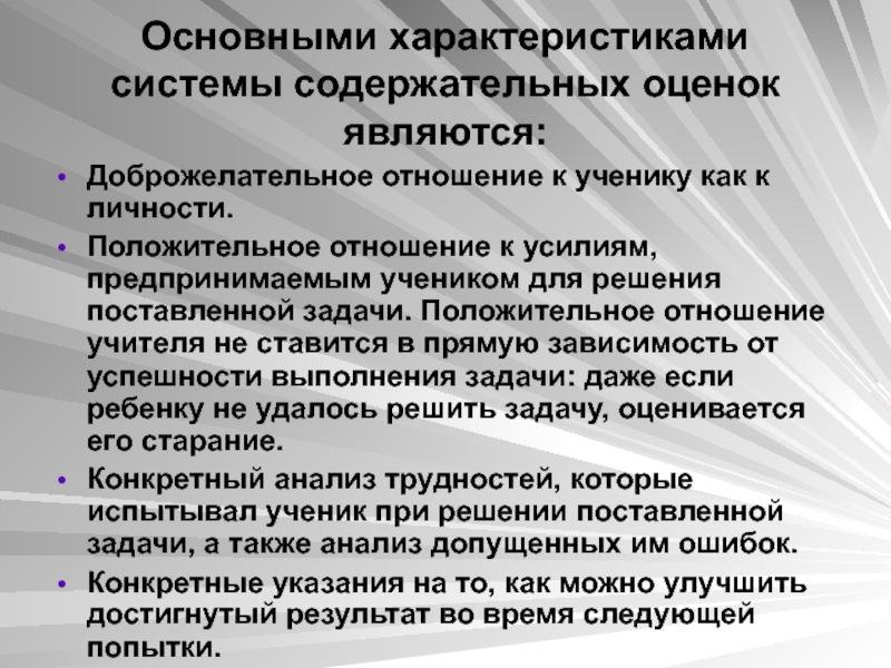 Слайд 73Основными характеристиками системы содержательных оценок являются: