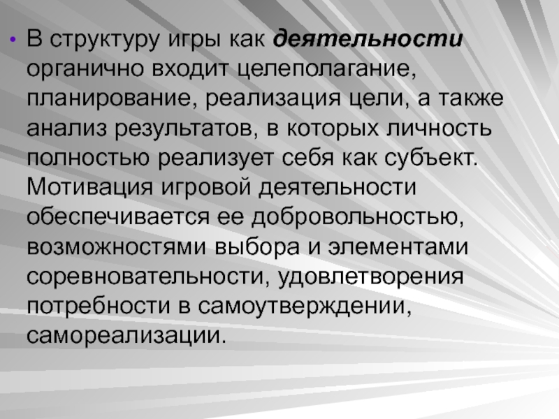 а также анализ результатов, в которых личность полностью реализует себя как субъект. Мотивация игровой деятельности обеспечивается ее добровольностью, возможностями выбора и элементами соревновательности, удовлетворения потребности в самоутверждении, самореализации.