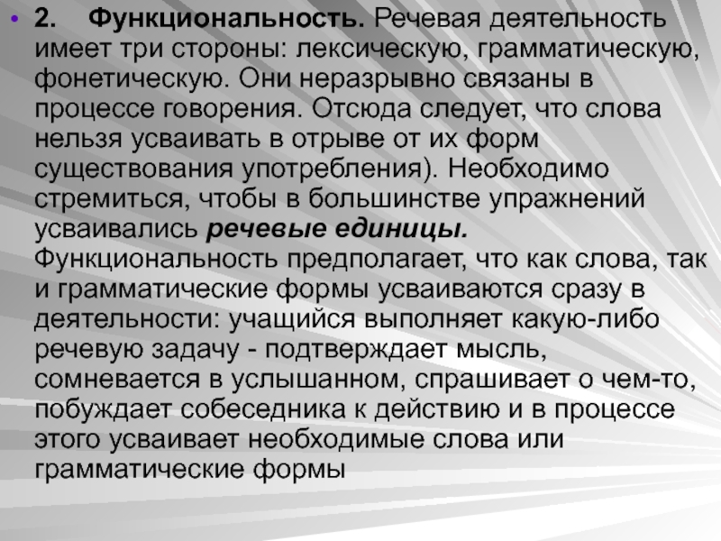 Слайд 582. Функциональность. Речевая деятельность имеет три стороны: лексическую, грамматическую, фонетическую. Они