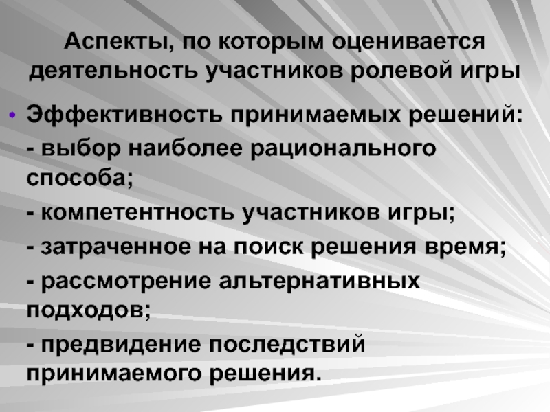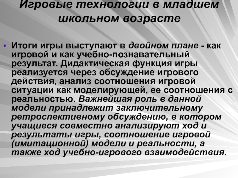 - как игровой и как учебно-познавательный результат. Дидактическая функция игры реализуется через обсуждение игрового действия, анализ соотношения игровой ситуации как моделирующей, ее соотношения с реальностью. Важнейшая роль в данной модели принадлежит заключительному ретроспективному обсуждению, в котором учащиеся совместно анализируют ход и результаты игры, соотношение игровой (имитационной) модели и реальности, а также ход учебно-игрового взаимодействия.