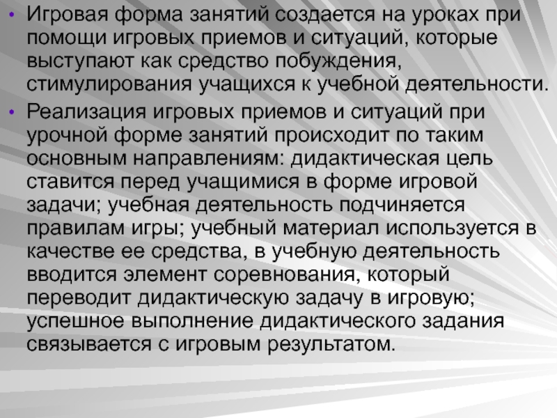 Реализация игровых приемов и ситуаций при урочной форме занятий происходит по таким основным направлениям: дидактическая цель ставится перед учащимися в форме игровой задачи; учебная деятельность подчиняется правилам игры; учебный материал используется в качестве ее средства, в учебную деятельность вводится элемент соревнования, который переводит дидактическую задачу в игровую; успешное выполнение дидактического задания связывается с игровым результатом.