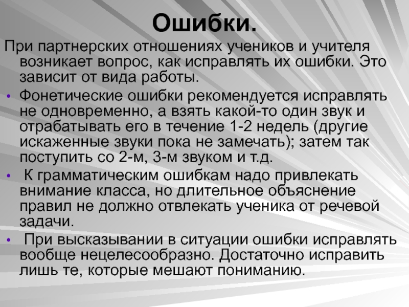 К грамматическим ошибкам надо привлекать внимание класса, но длительное объяснение правил не должно отвлекать ученика от речевой задачи.