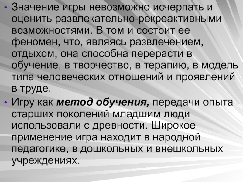 Слайд 9Значение игры невозможно исчерпать и оценить развлекательно-рекреактивными возможностями. В том и