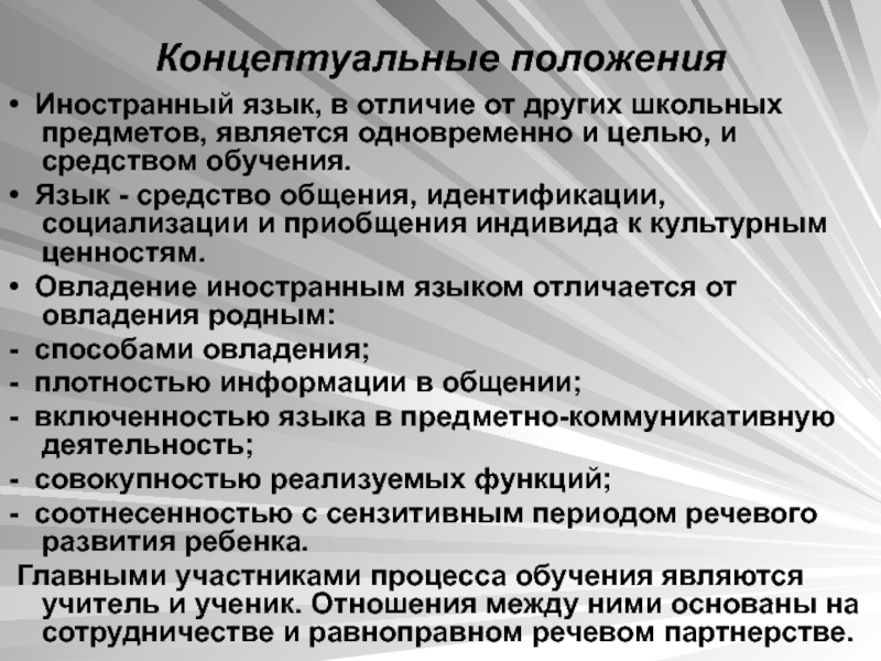 Главными участниками процесса обучения являются учитель и ученик. Отношения между ними основаны на сотрудничестве и равноправном речевом партнерстве.