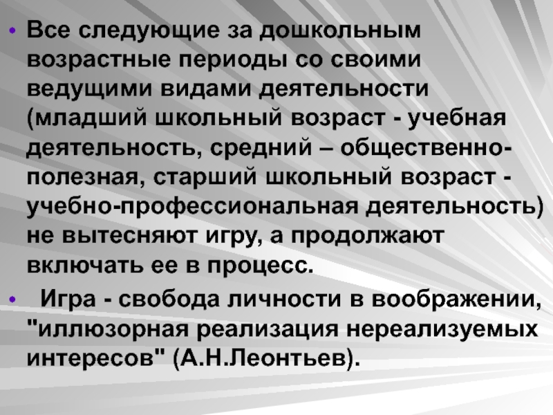 (младший школьный возраст - учебная деятельность, средний – общественно-полезная, старший школьный возраст - учебно-профессиональная деятельность) не вытесняют игру, а продолжают включать ее в процесс.