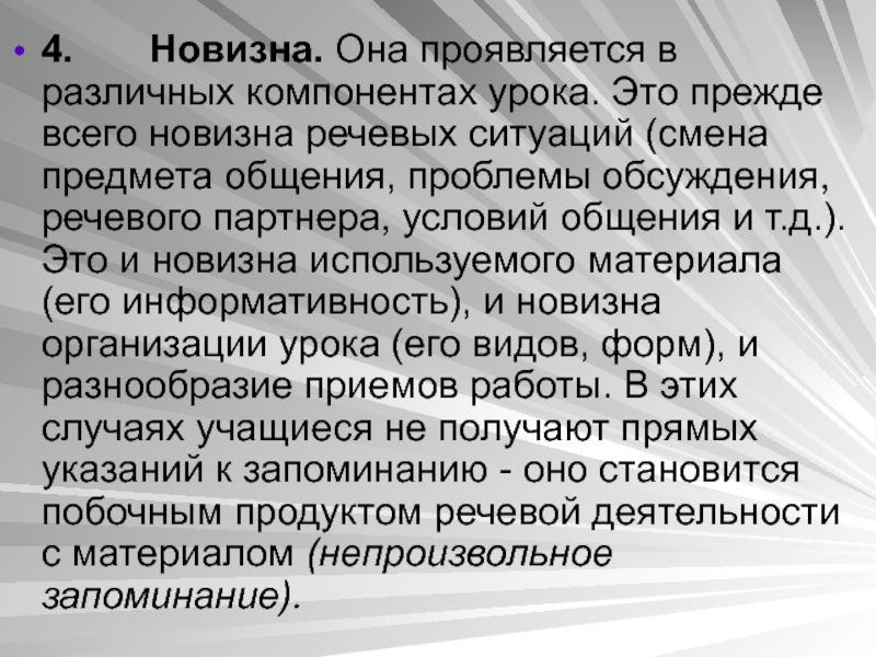 новизна речевых ситуаций (смена предмета общения, проблемы обсуждения, речевого партнера, условий общения и т.д.). Это и новизна используемого материала (его информативность), и новизна организации урока (его видов, форм), и разнообразие приемов работы. В этих случаях учащиеся не получают прямых указаний к запоминанию - оно становится побочным продуктом речевой деятельности с материалом (непроизвольное запоминание).