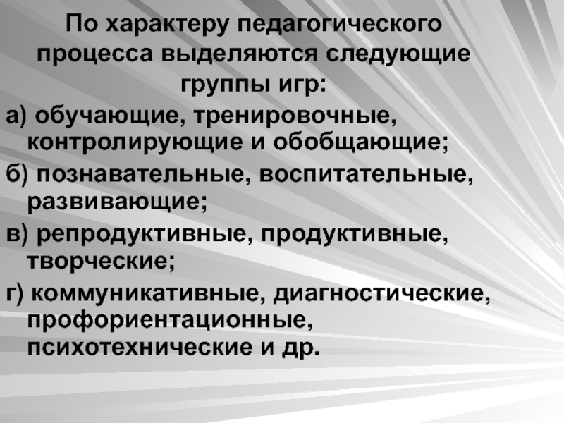 Слайд 14По характеру педагогического процесса выделяются следующие группы игр: