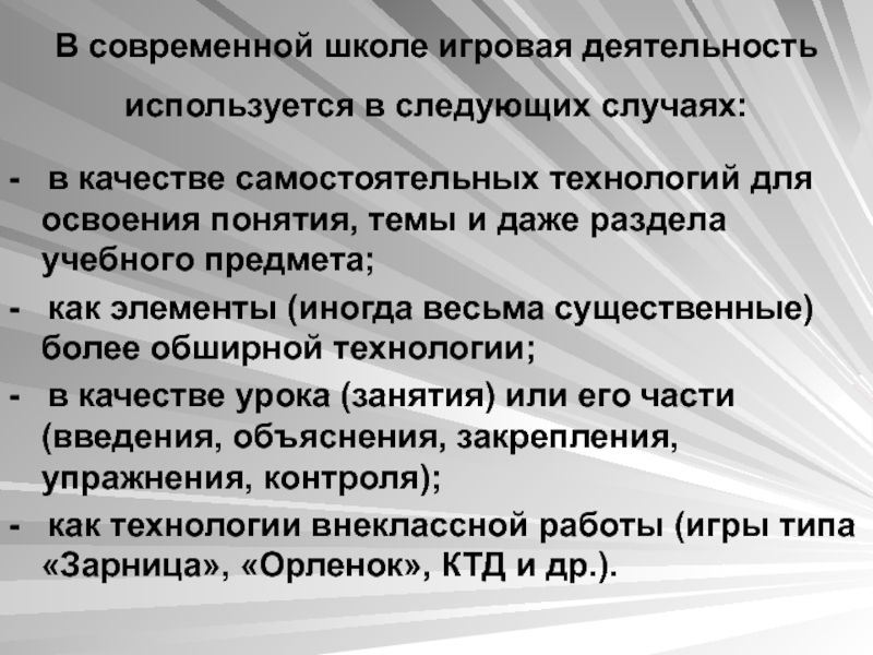 В современной школе игровая деятельность используется в следующих случаях: