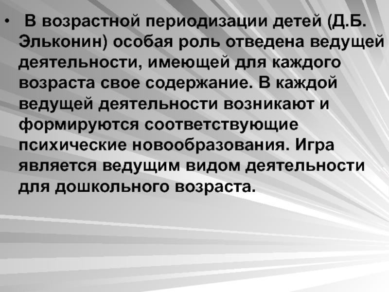 Слайд 20• В возрастной периодизации детей (Д.Б.Эльконин) особая роль отведена ведущей деятельности,
