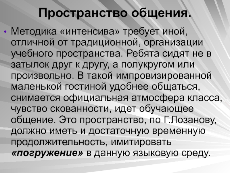 пространства. Ребята сидят не в затылок друг к другу, а полукругом или произвольно. В такой импровизированной маленькой гостиной удобнее общаться, снимается официальная атмосфера класса, чувство скованности, идет обучающее общение. Это пространство, по Г.Лозанову, должно иметь и достаточную временную продолжительность, имитировать «погружение» в данную языковую среду.