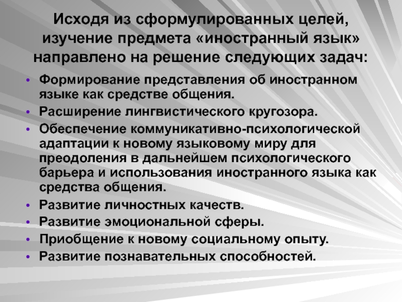 Слайд 69Исходя из сформулированных целей, изучение предмета «иностранный язык» направлено на решение