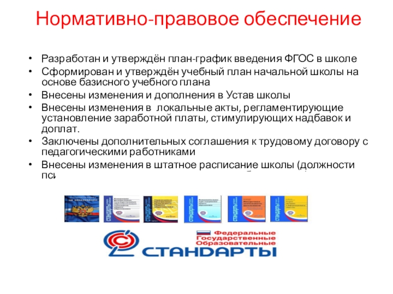 нормативная база образовательного учреждения приведена в соответствие с требованиями ФГОС (цели образовательного процесса, режим занятий, финансирование, материально-техническое обеспечение и т. п.);