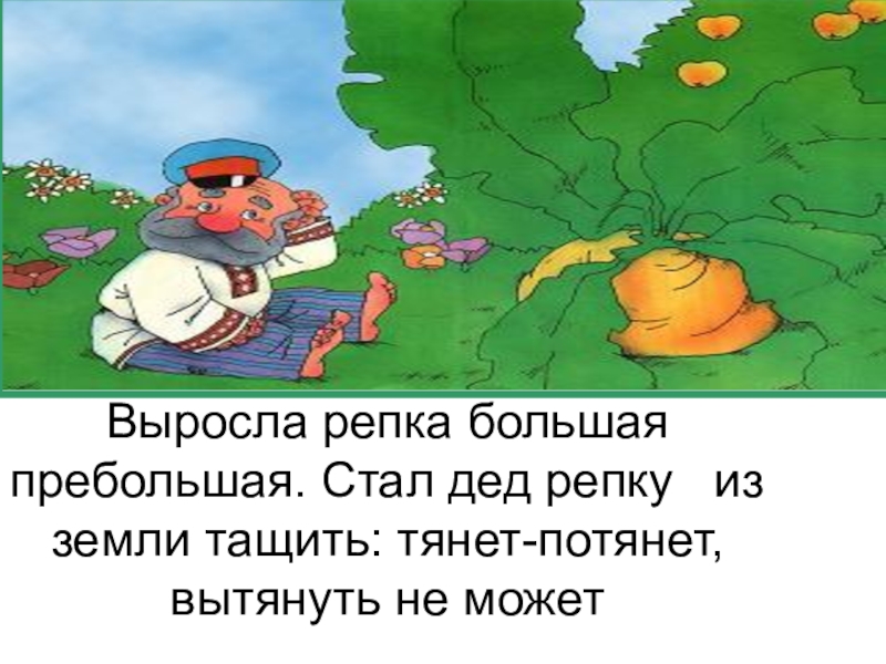 Слайд 3Выросла репка большая пребольшая. Стал дед репку  из земли тащить: тянет-потянет,