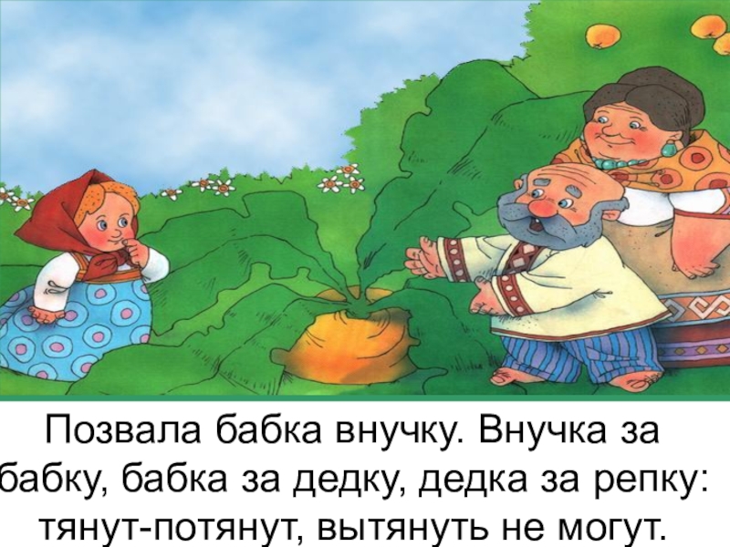 Позвала бабка внучку. Внучка за бабку, бабка за дедку, дедка за репку: тянут-потянут, вытянуть не могут.