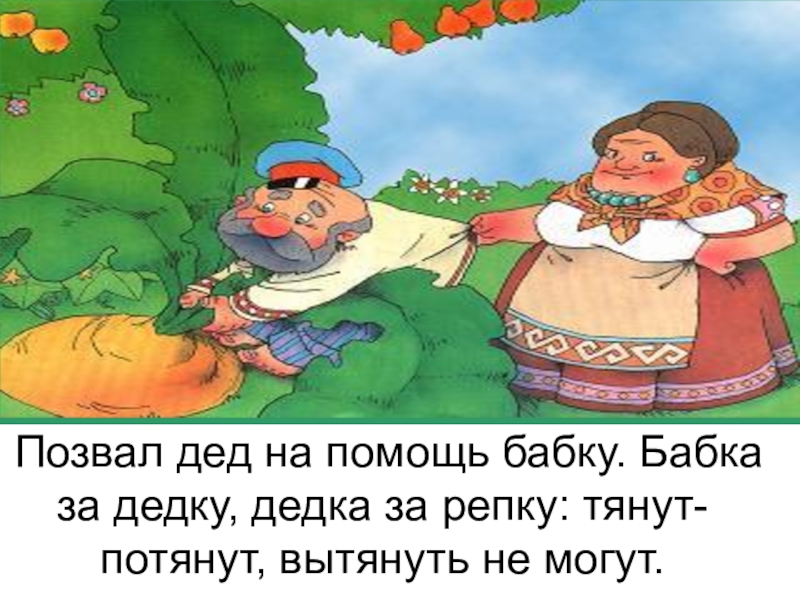 Позвал дед на помощь бабку. Бабка за дедку, дедка за репку: тянут-потянут, вытянуть не могут.