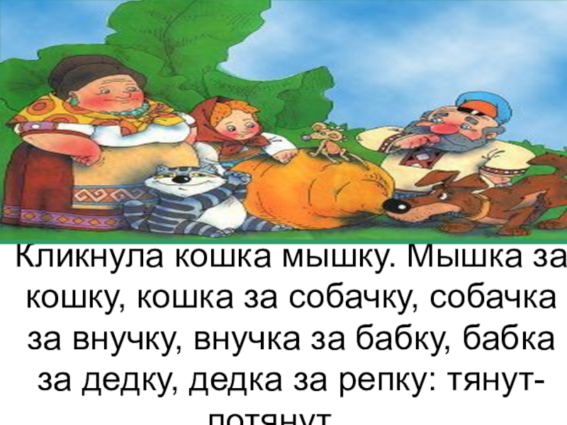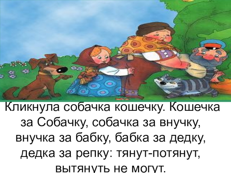 Слайд 6Кликнула внучка собачку. Собачка за внучку, внучка за бабку, бабка за