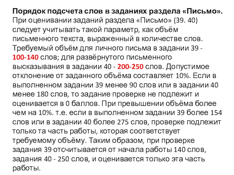 (39. 40) следует учитывать такой параметр, как объём письменного текста, выраженный в количестве слов. Требуемый объём для личного письма в задании 39 - 100-140 слов; для развёрнутого письменного высказывания в задании 40 - 200-250 слов. Допустимое отклонение от заданного объёма составляет 10%. Если в выполненном задании 39 менее 90 слов или в задании 40 менее 180 слов, то задание проверке не подлежит и оценивается в 0 баллов. При превышении объёма более чем на 10%. т.е. если в выполненном задании 39 более 154 слов или в задании 40 более 275 слов, проверке подлежит только та часть работы, которая соответствует требуемому объёму. Таким образом, при проверке задания 39 отсчитывается от начала работы 140 слов, задания 40 - 250 слов, и оценивается только эта часть работы.