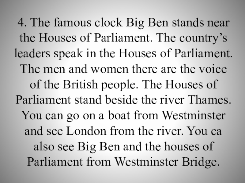 Известные часы Биг Бен находятся возле Дома Парламента.
