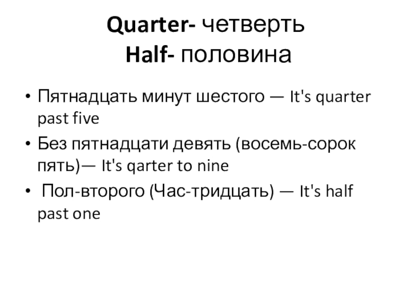Quarter- четверть  Half- половинаПятнадцать минут шестого — It's quarter past five Без пятнадцати девять (восемь-сорок пять)— It's qarter