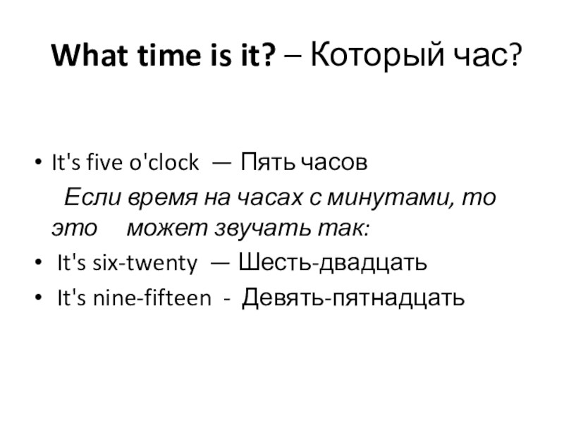 What time is it? – Который час? It's five o'clock  — Пять часов Если время на часах с минутами, то это может звучать так: It's six-twenty  — Шесть-двадцать It's nine-fifteen  -  Девять-пятнадцать