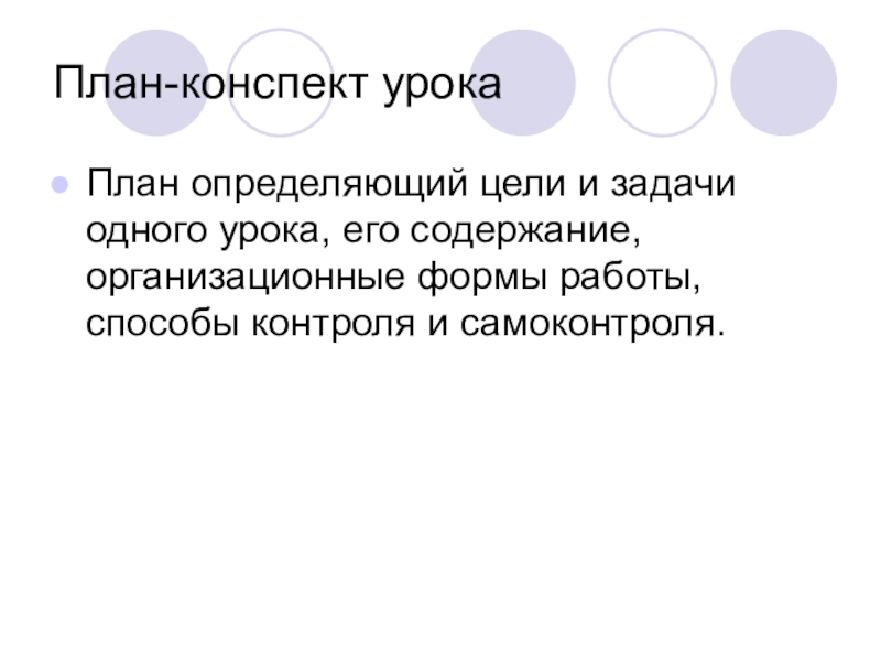 План-конспект урокаПлан определяющий цели и задачи одного урока, его содержание, организационные формы работы, способы контроля и самоконтроля.