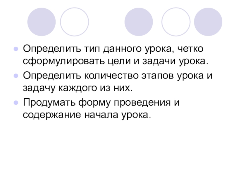 Определить тип данного урока, четко сформулировать цели и задачи урока.Определить количество этапов урока и задачу каждого из